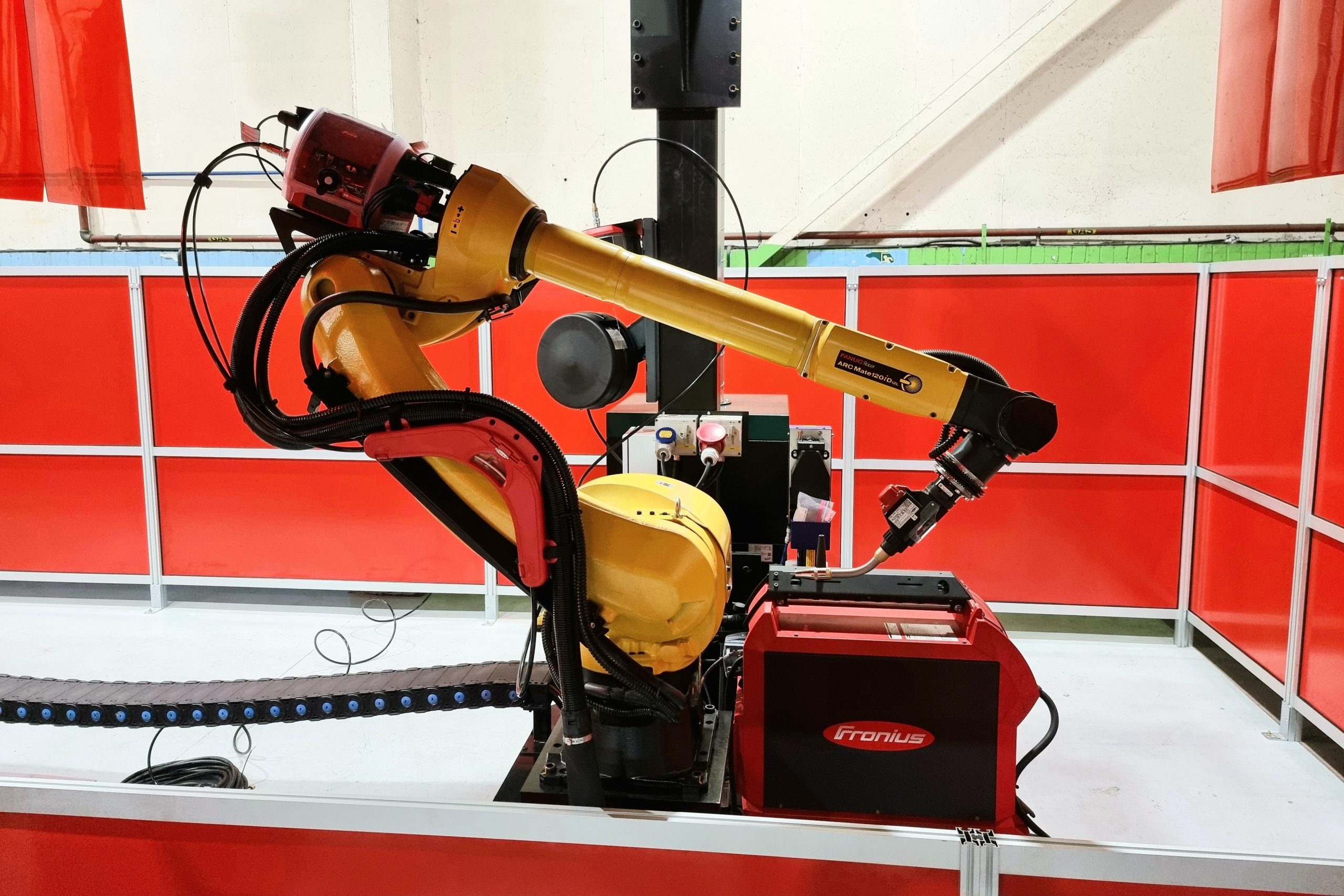 The robot uses a Fronius TPS 400i pulse mig welding unit and a Fanuc Arc Mate 100id 8L robot arm along with a R30iC controller. Its capable of welding Aluminium, Stainless and Mild steel up to 3 metres in length. It can do from 3 amps up to 400 amps making it very versatile.